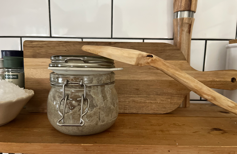 Hmm, "mata den", jaja redan där tänkte jag att ordet tålamod lär vara en bra faktor att ha med mig. Jag ställde upp den i ett skåp ovanför vår spis.. och glömde den! Tills jag en dag hörde ett "knall" och när jag öppnade skåpet rann massan nerför skåpet och jag insåg att den hade matat sig själv och fått liv!! Ha, ha, ha. Nåväl, nu har jag alltså själv en glasburk och tillrett massan. Denna ska jag nu med tålamod och omsorg mata, med målet att om ca 5 dagar ta revansch på mig själv! Häng med i nästkommande inlägg så ska jag berätta hur det gick. Tack för utvecklingsmöjligheten Jens.